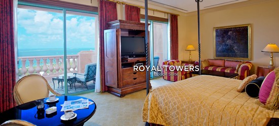 The Bridge Suite is Royal Tower’s premiere accommodation. Royal Towers Bridge Suites offer guests spectacular views and ten sumptuous rooms full of unique amenities—including a 1,250-square-foot living room with a grand piano and twin entertainment centers, a dining room capped with a 22-karat gold chandelier and truly spacious bedrooms. The suites have 12-foot ceilings throughout with full length windows looking out from the bridge spanning Royal Towers’ 23rd floor. Bridge Suites also offer vacationers a permanent staff of seven, who access the rooms via a private entrance.